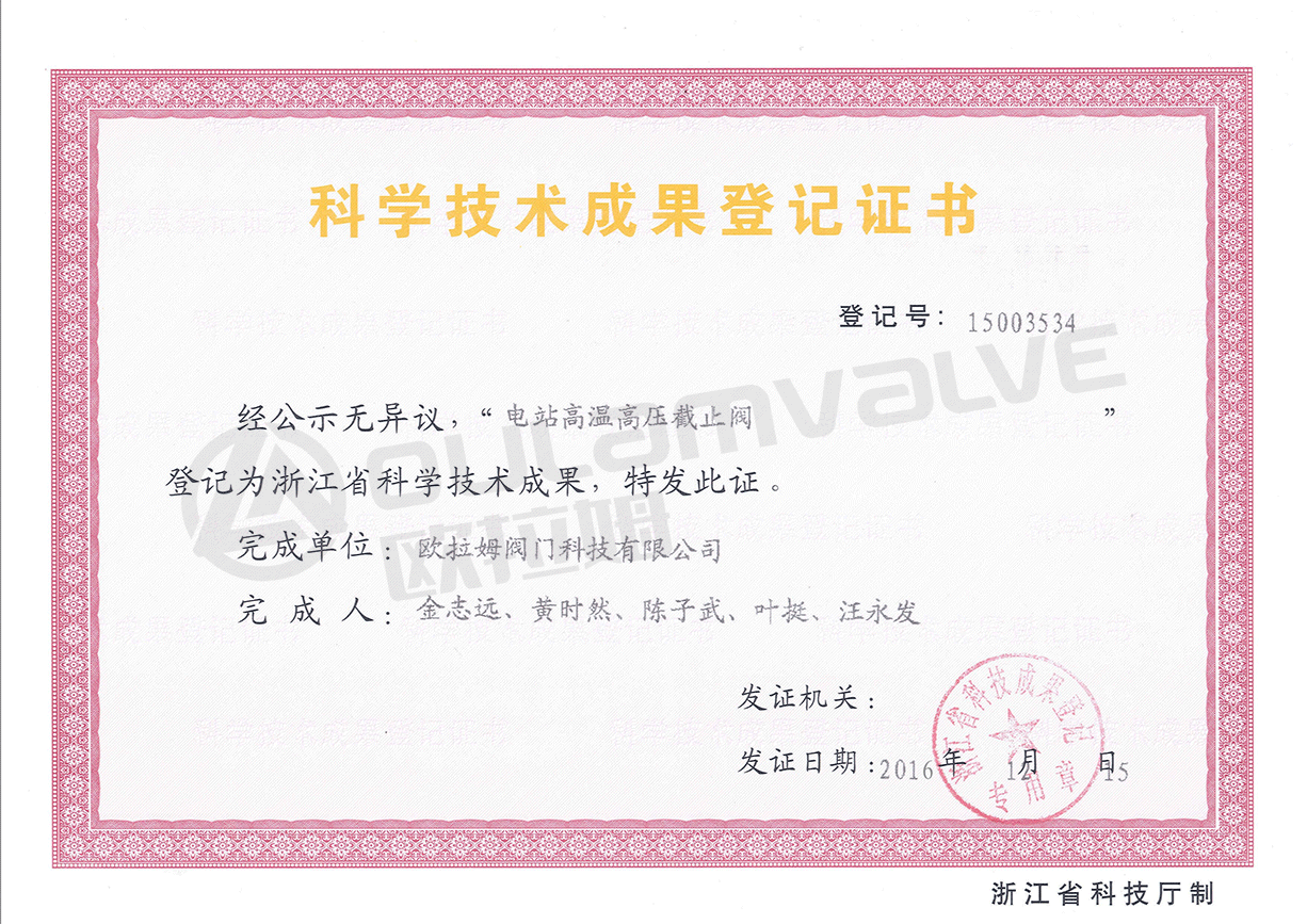 浙江省科學(xué)技術(shù)成果:電站高溫高壓截止閥