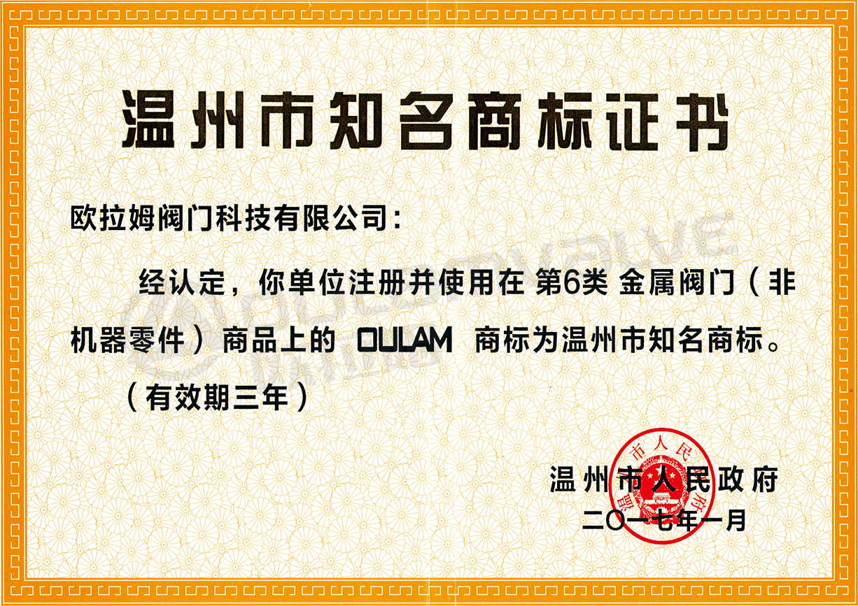 溫州市知名商標(biāo)證書(shū)