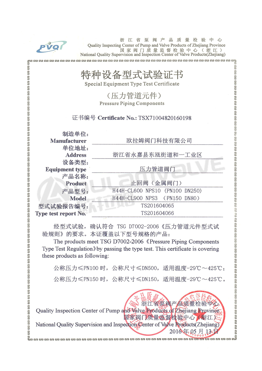 止回閥特種設(shè)備型式試驗(yàn)證書(shū)