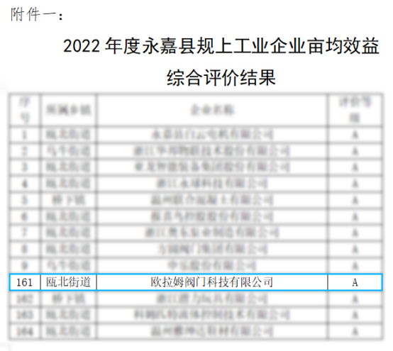 不以規(guī)模定標(biāo)準(zhǔn),而以“畝均論英雄”。近日,根據(jù)《深化“畝均論英雄”改革2023年工作要點(diǎn)》文件精神,永嘉縣深化“畝均論英雄”改革工作領(lǐng)導(dǎo)小組辦公室發(fā)函相關(guān)部門,對相關(guān)數(shù)據(jù)進(jìn)行了收集與校對。并按照綜合評價(jià)辦法,對全縣相關(guān)工業(yè)企業(yè)進(jìn)行分類評價(jià)。經(jīng)評定,歐拉姆被評定為2022年度永嘉縣規(guī)上工業(yè)企業(yè)畝均效益A類企業(yè)。