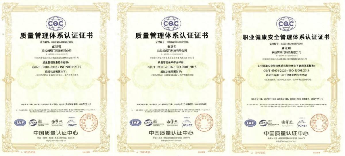 “熱烈祝賀歐拉姆閥門科技有限公司順利通過“質(zhì)量/環(huán)境/職業(yè)健康安全”的認(rèn)證復(fù)審!此次公司成功圓滿的通過,表明歐拉姆質(zhì)量、環(huán)境、職業(yè)健康安全管理體系運(yùn)行及執(zhí)行情況符合標(biāo)準(zhǔn)要求和公司相關(guān)文件規(guī)定!”