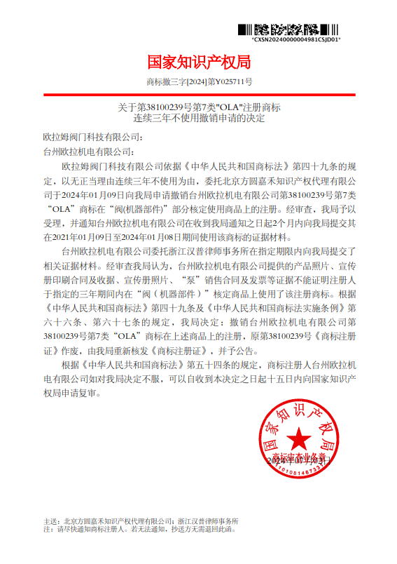 近日,國家知識產(chǎn)權(quán)局作出決定,撤銷臺州歐拉機電有限公司第38100239號第7類“OLA”商標在“閥(機器部件)”商品上的注冊。這一成果得益于歐拉姆閥門科技有限公司的積極維權(quán)行動。