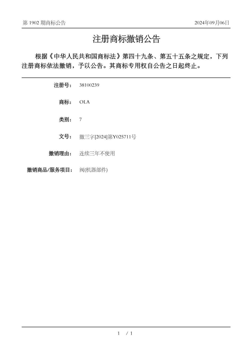 知識產(chǎn)權(quán)局決定:接受歐拉姆閥門科技有限公司的撤銷申請,撤銷臺州歐拉機電有限公司第38100239號第7類“OLA”商標在上述商品上的注冊,原《商標注冊證》作廢,并將重新核發(fā)《商標注冊證》并公告。