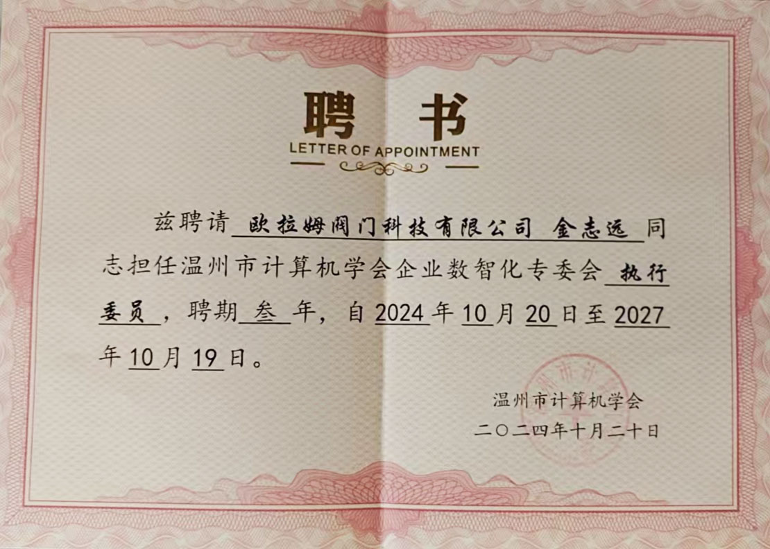 10月26日溫州市計(jì)算機(jī)學(xué)會企業(yè)數(shù)智化專業(yè)委員會成立大會在溫州數(shù)據(jù)研究院召開,標(biāo)志著溫州市在企業(yè)數(shù)智化領(lǐng)域邁出了堅(jiān)實(shí)的一步。在這次大會上,歐拉姆閥門科技有限公司董事長金志遠(yuǎn)被聘任為溫州市計(jì)算機(jī)學(xué)會企業(yè)數(shù)智化專業(yè)委員會執(zhí)行委員。