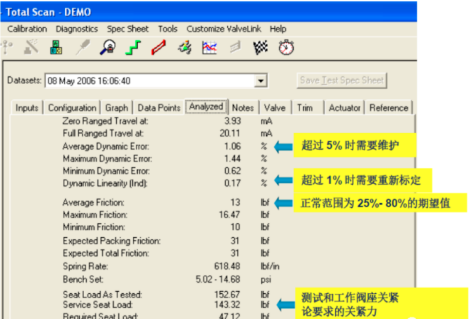 提供閥門動(dòng)態(tài)誤差帶曲線,以及分析平均動(dòng)態(tài)誤差;平均線性度;閥門的滯后與死區(qū)等數(shù)據(jù),以決定何時(shí)閥門需要重新校驗(yàn)或檢修。
