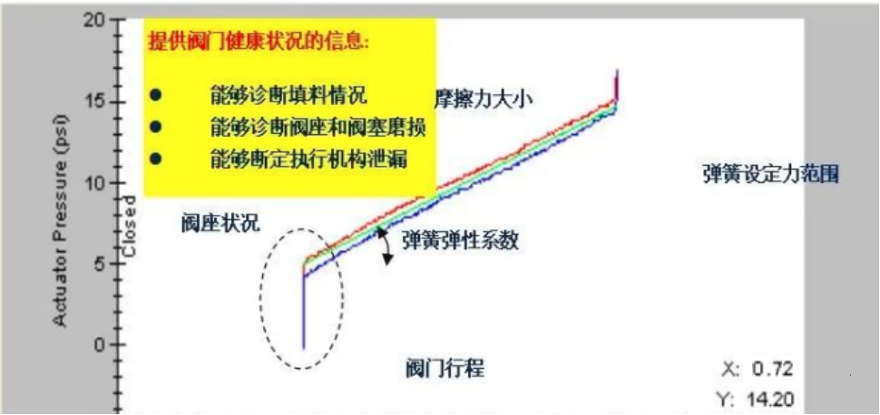 提供曲線并分析數(shù)據(jù)包括填料摩擦力(直行程閥門),摩擦力矩(旋轉(zhuǎn)閥),閥座關(guān)緊力,彈簧預(yù)緊力等,以判斷閥門填料,閥座,彈簧和執(zhí)行機(jī)構(gòu)有關(guān)的問題或故障。